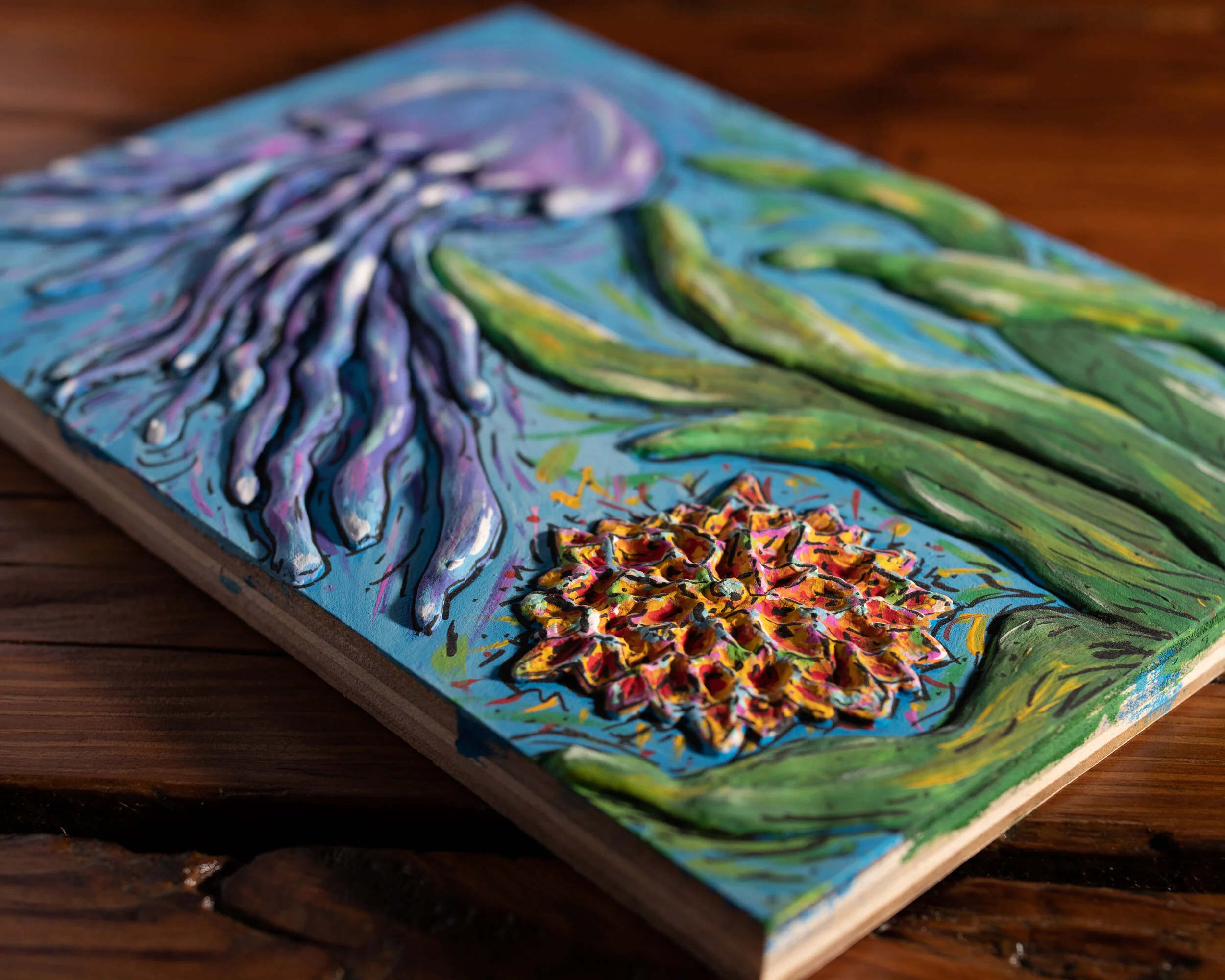 spackle, acrylic paint, and archival ink on wood